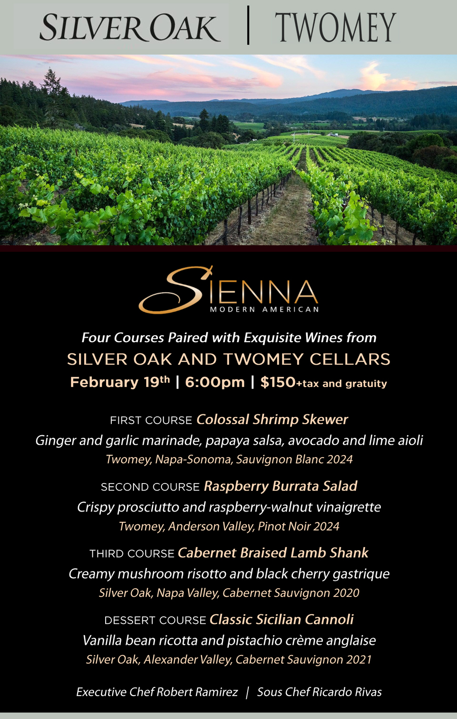 Enjoy an evening of elevated dining at Sienna. Each tasting dinner features a thoughtfully crafted multi-course menu designed to showcase distinctive flavors, seasonal ingredients, and inspired culinary creativity. These special events offer a memorable experience for curious food lovers and guests who enjoy exploring exceptional cuisine.